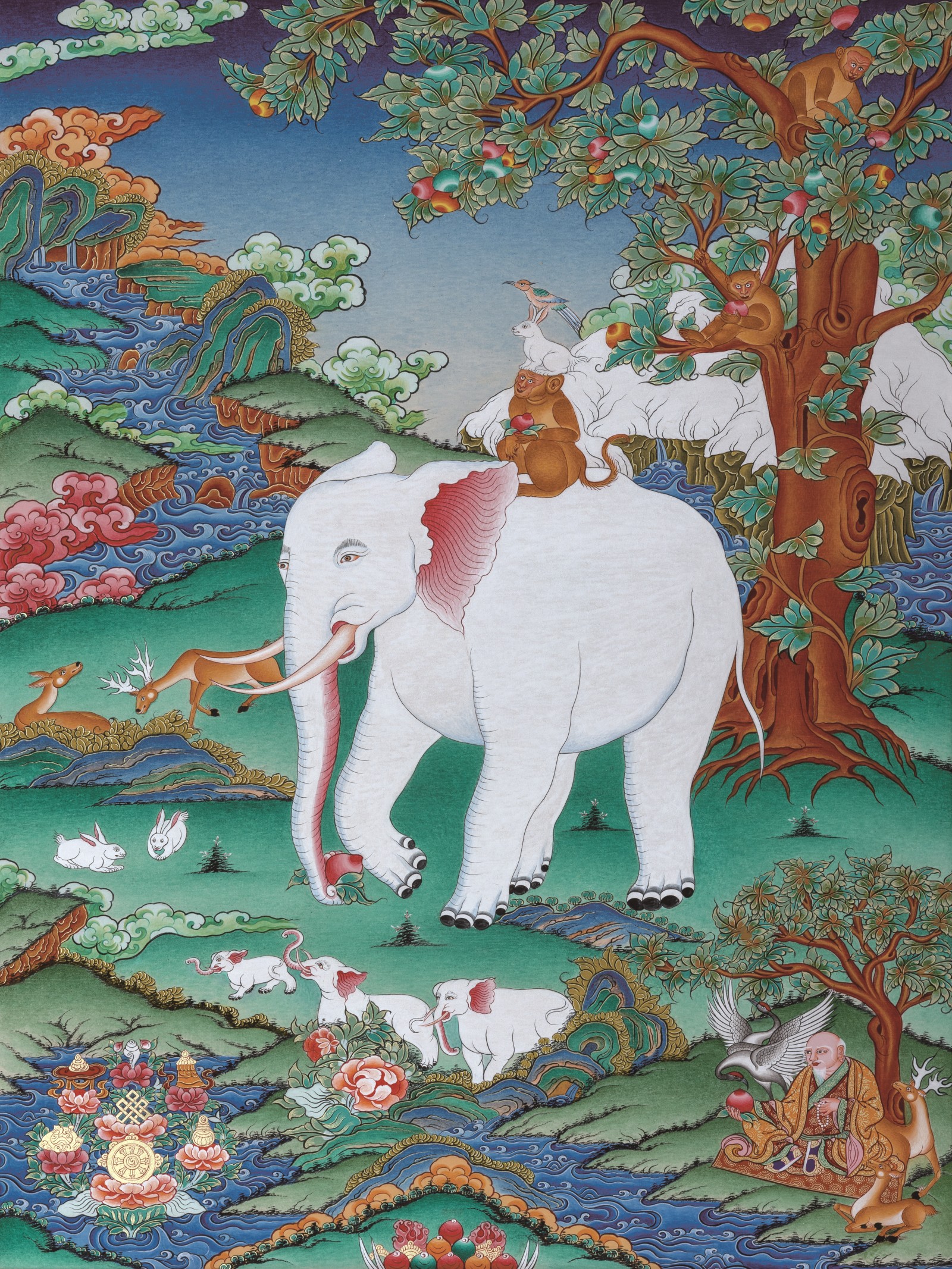 Thousand-Year Xizang,china Auspicious Totem・Four Harmonious Friends Thangka | Hand-Painted One-Of-A-Kind Masterpiece by Kuan Ta Cai Rang
